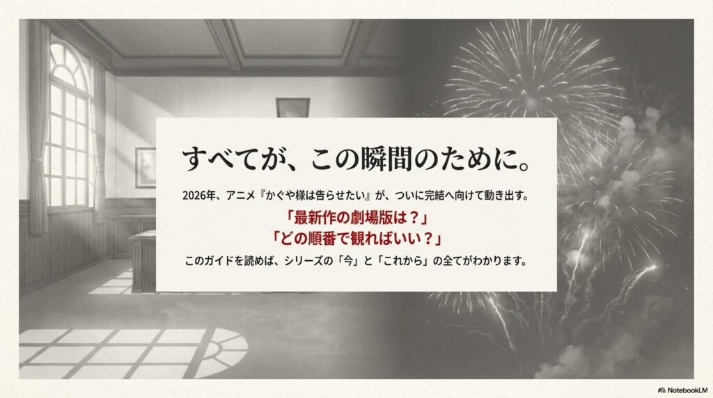 ここまで、かぐや様は告らせたい アニメの最新動向から深掘り情報までを整理してきました。2026年は、劇場版完結編によってこの長い物語に一つの区切りがつく節目の年になります。視聴順を確認し、配信状況をチェックしながら、万全の状態で完結編を迎えたいですね。天才たちの恋愛頭脳戦がどのような結末を迎えるのか、ファンとしてしっかり見届けましょう。
